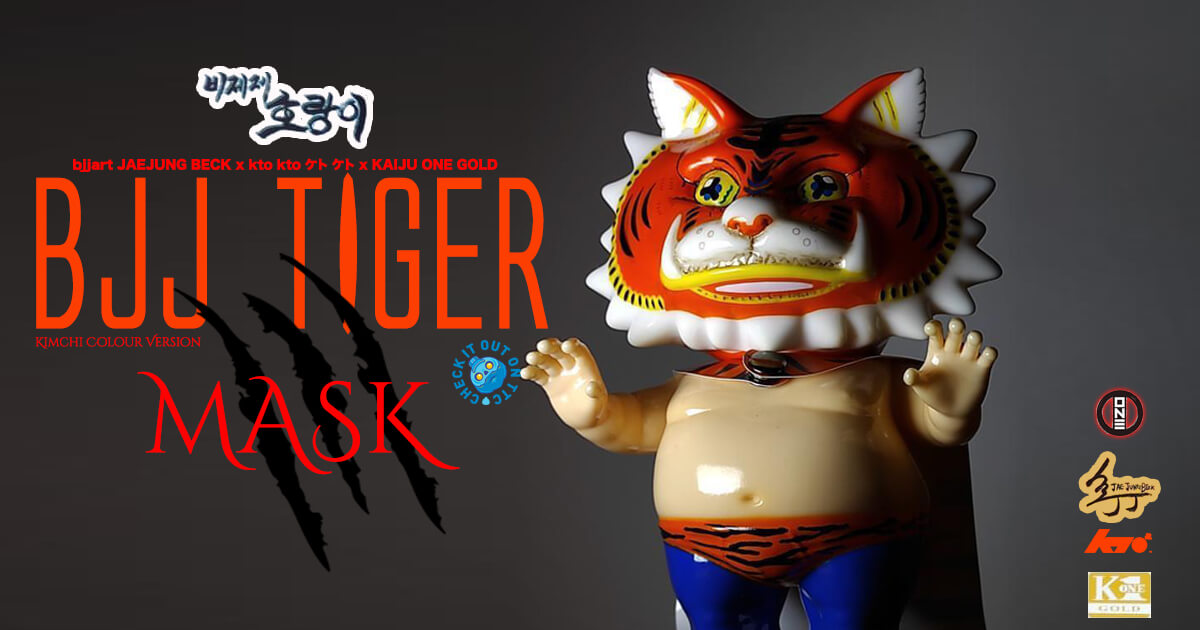 KAIJU ONE GOLD’s second launch – the collaboration with OPPA Beck Jae Jung ( bjjart / the Korean mastermind ) – “The BJJ TIGER MASK” – Kimchi Colour Version ~ You may recall earlier on in the year when bjjart 백재중 JAE JUNG BECK- X kto kto ケト ケト x KAIJU ONE GOLD presented to us the BJJ Tiger which saw Kaiju one bringing bjjart 백재중 JAEJUNG BECK’s illustrations into a full vinyl version of JAEJUNG’sBJJ Tiger. NOW we meet the Tiger tamer! spandex ready, mask on its time for the main event of the evening!
